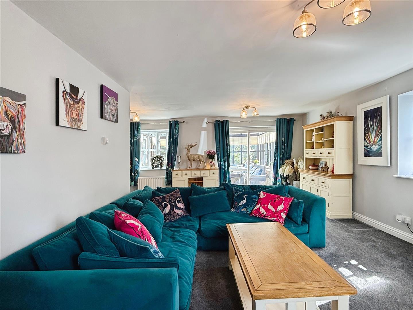 The lounge features an inviting L-shaped design, combining both lounge and dining areas. The lounge section has a fitted carpet and includes a log effect fire with an attractive surround. Double-glazed windows to the front and side aspects allow for ample natural light, complemented by a radiator and a central light fixture. The open-plan dining area features sliding doors leading into the conservatory, which is filled with light and offers additional space for entertaining.