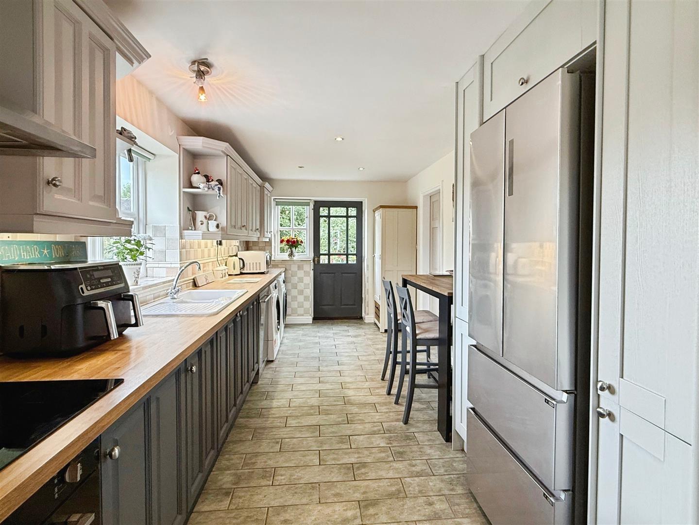 The well-appointed kitchen extends from front to back, offering abundant storage and practical workspace, with convenient access to the garden.