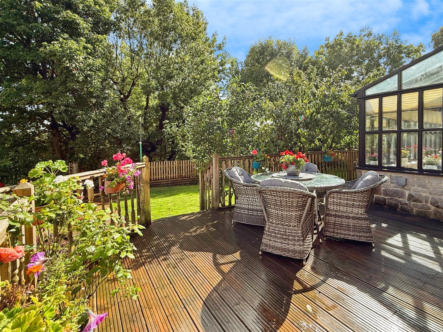 The property is approached via a spacious block-paved driveway, providing off-street parking for three cars and leading to a detached double garage. The garage features up-and-over doors, power, and lighting, with pedestrian access from the side of the property. Gated access leads to the side of the house and onto the rear garden, which is generously sized and enclosed by fencing and dry stone walling, surrounded by mature trees for added privacy. A raised seating patio area is decked and connects directly from the conservatory, with steps leading down to the main garden area, creating an inviting outdoor space for relaxation and entertainment.